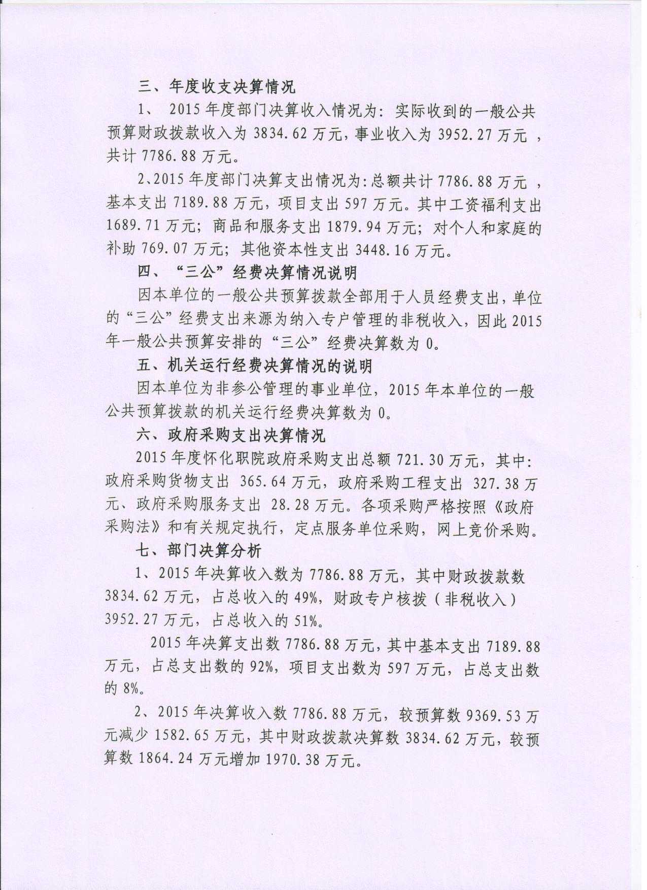 怀化职业技术学院2015年度部门决算公开说明