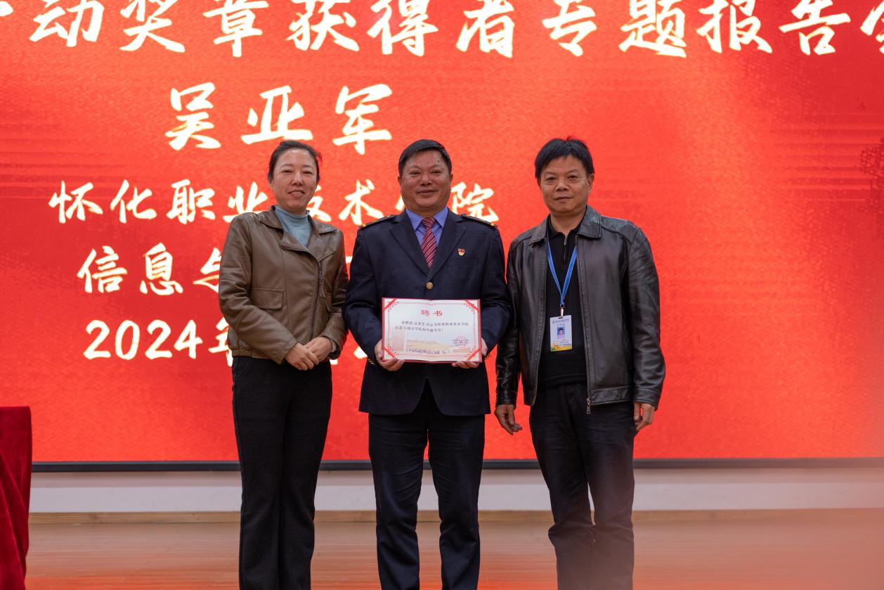 11月22日,学校举行大国工匠进校园专题报告会。全国五一劳动奖章、全国铁路劳动模范、火车头奖章、全路技术能手、广铁工匠、广铁集团怀化电务段怀化高铁信号车间高级技师吴亚军受聘为学校信息与设计学院校外辅导员。
