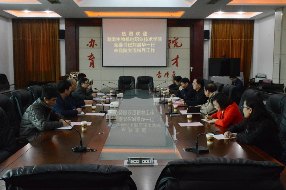 11月16日上午,湖南生物机电职业技术学院党委书记刘启华、党委副书记、副院长梁勇、副院长黎移新等一行5人莅临我院考察交流工作,我院党委书记胡佳武、院长王聪田、党委副书记邬国盛等领导进行了热情接待。